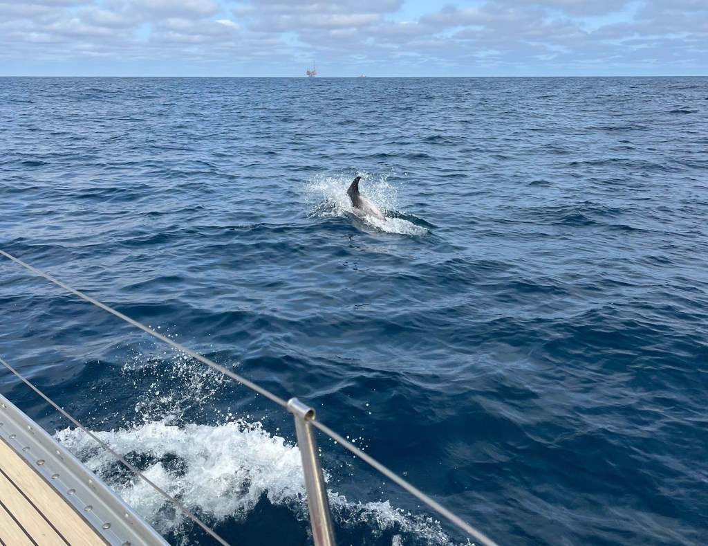 Efter første døgn begyndte dønningerne så småt at lægge sig. En herlig sejlads gennem området med olieplatforme og endda med fint besøg af delfiner. Det første besøg af forhåbentligt mange. Jeg tror aldrig, jeg bliver træt af studere hverken dem eller havfuglene, som følger os.