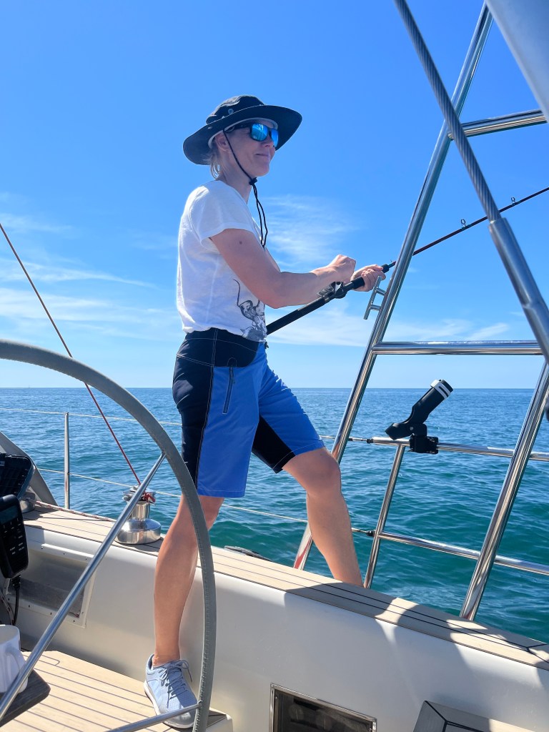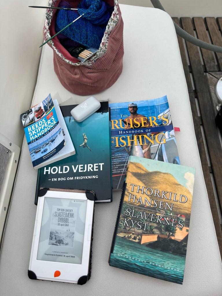 får man sig en lur, læser en bog, kigger ud over havet og filosoferer over, hvor heldig man er, fisker (indtil videre uden held…),får sig en lur mere, hører en lydbog eller en podcast, strikker, styrketræner (red: Det er kun Rikke-Louise, der strikker og træner, den slags er ikke noget for Morgan), reparerer et eller andet, der er gået i stykker.