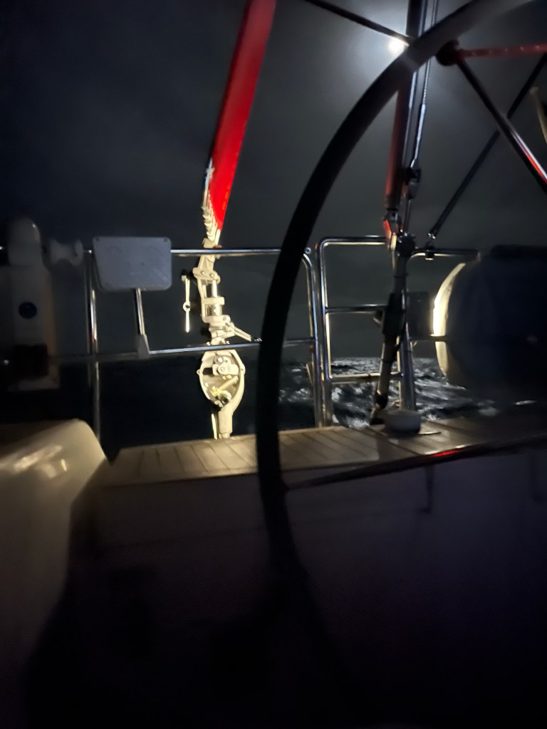 I forbindelse med nattevagterne har vi to ufravigelige krav: Vi skal bære redningsvest, og vi må ikke gå på dæk alene. Er der behov for hjælp, purres den, der har hvil, eksempelvis hvis der skal bommes (hvis vinden skifter side, når den kommer ind agten fra – altså fra modsatte side, og bommen derfor skal svinge), som storsejlet sidder på skal ‘svinge’, rebes ind eller ud (når storsejlet skal gøres mindre eller større i areal grundet vind), hvis sejl skal sættes eller bjerges, eller hvis der bare er noget der er udfordrende.