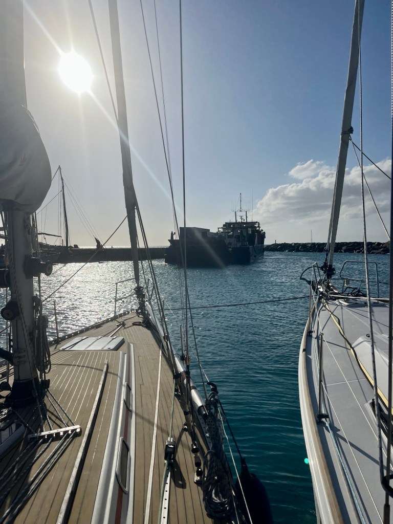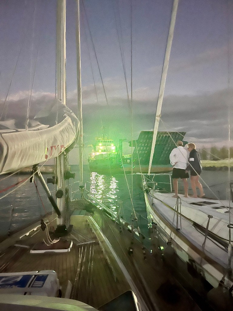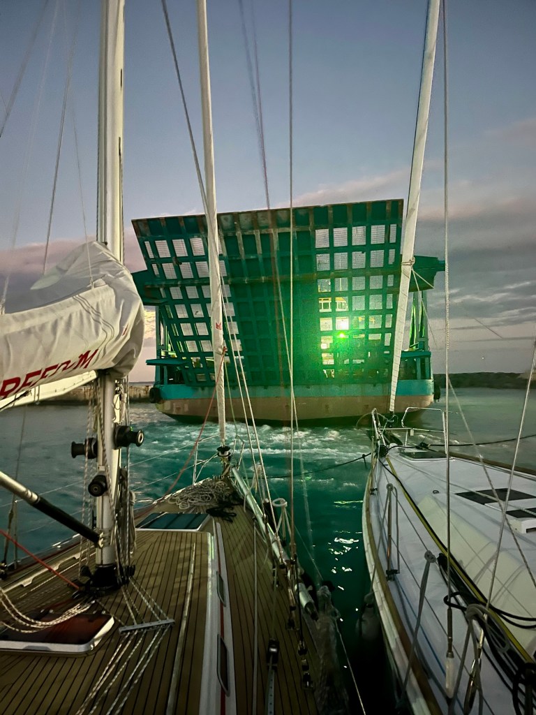 I to spring er jeg ude af sengen, har taget en t-shirt over hovedet og fået briller på. Det skal gå stærkt, for vi har fire liner på tværs henover havnebassinet, altså tværs over den rampe, som de store forsyningsskibe bruger til lodsning. “Hvorfor er der ingen, der fortalte os om det her i går” mumler jeg irriteret, mens jeg en efter en får hevet alle vores liner over på båden. Liner som Morgan er løbet over for at løsne fra pullerterne på den anden side af havnebassinet.