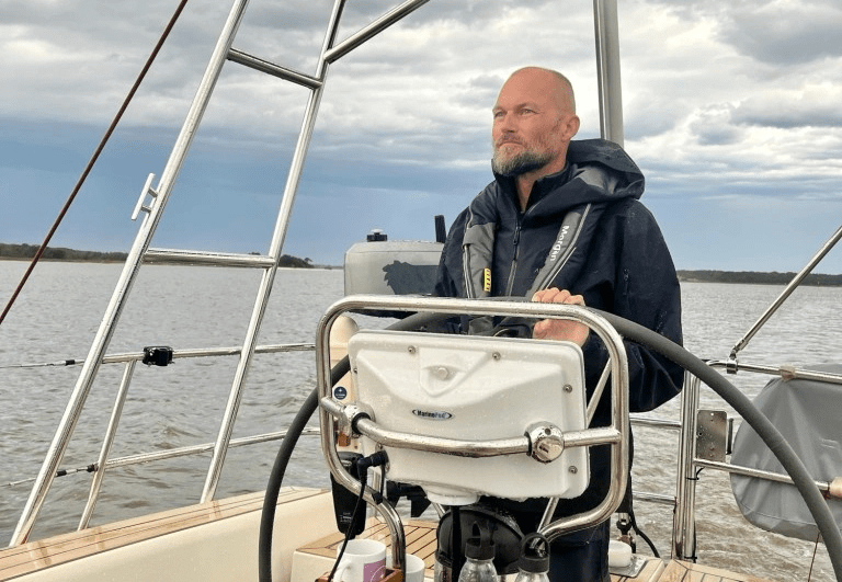 Der er kraft på, og Morgan kæmper med fuld ratudsving, så store er bølgerne. Tungen skal holdes lige i munden nu, for ikke mange meter fra os kan vi se klipperne stikke op, lige på den anden side af kanalens bøjeafmærkning. Volvo Pentaen arbejder på højtryk, men der er heldigvis ingen mislyde. Godt man har en kaptajn, der gør sig umage og vedligeholder hver en stump af båden til perfektion.