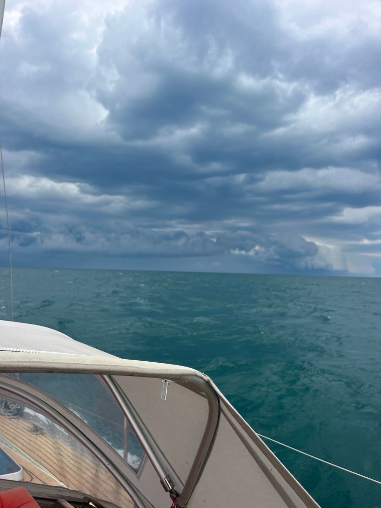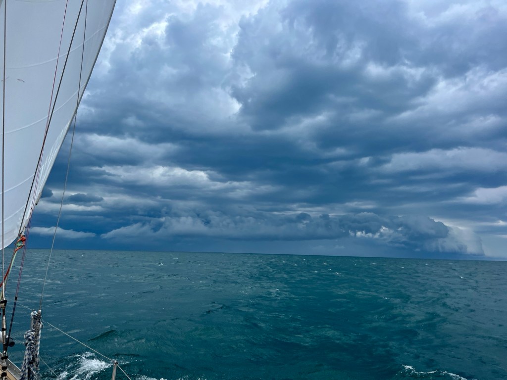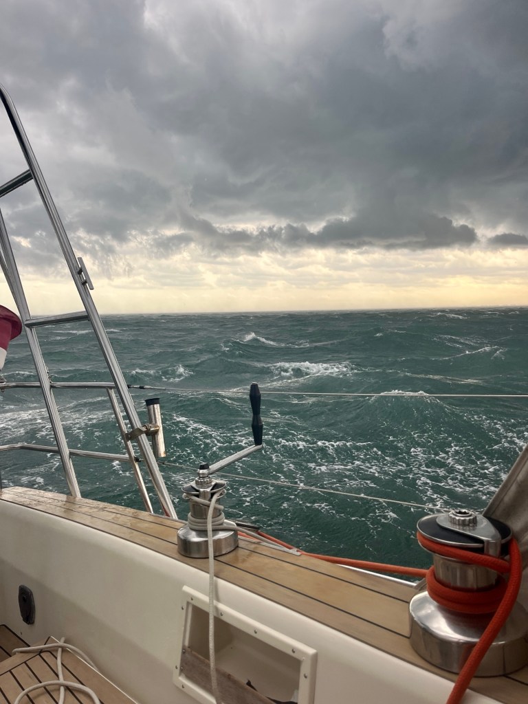 Vi er enige om, at det var godt, at vi fik bjerget sejlene så hurtigt, og at det er bedre at gøre det for tidligt, end for sent. Havde vi været bare minutter længere om at få det gjort, var det ikke sikkert, at vi stadig havde en intakt sejlgarderobe. Nuvel, bare fordi det trækker op til dårligt vejr, skal man ikke per automatik smide kludene, men det var for os en god påmindelse om, at forudseenhed kan spare os for mange kvaler.