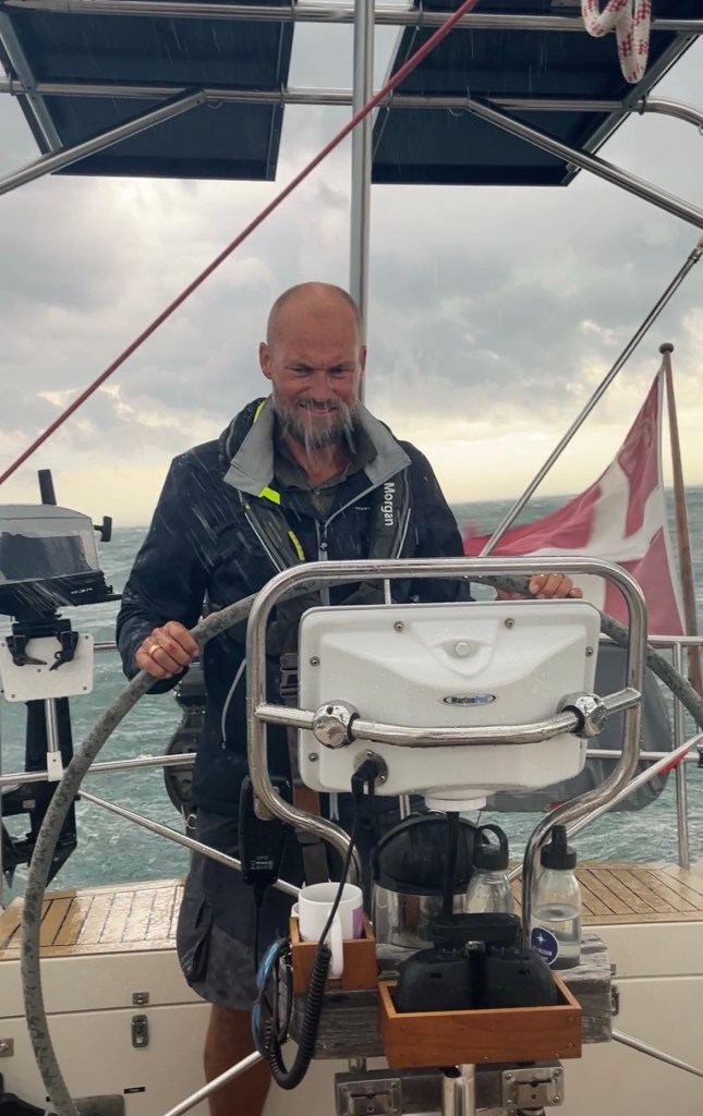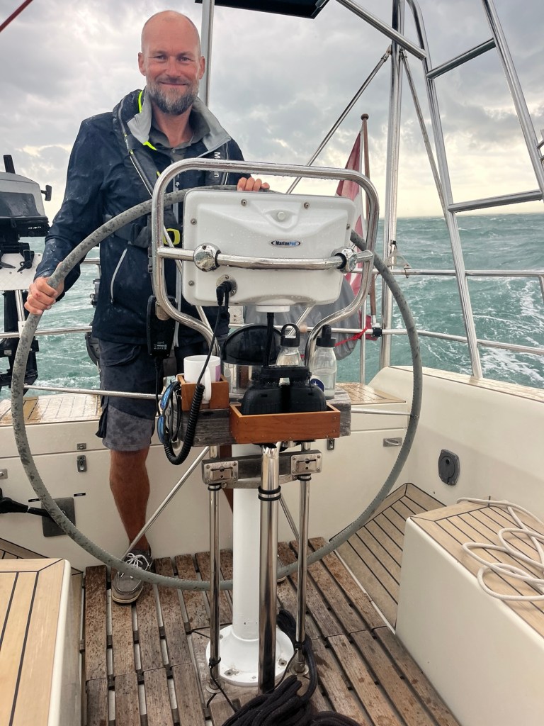 Forsejlets størrelse skal reduceres ved at rulle det lidt ind, og Morgan må bruge et spilhåndtag for at lykkes – det klarer vi normalt med armkræfter, men der er tryk på nu, det blæser 25 sekundmeter – stormen er over os!