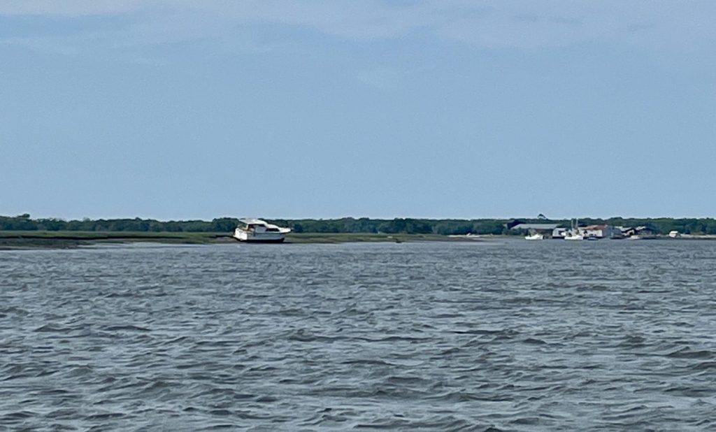 Rikke-Louise sidder i bogstavelig forstand og skriver på nærværende blogindlæg, da Morgan oppe fra hullet til cockpittet udbryder “Hold da kæft, kom lige at se!” Rikke-Louise skynder sig op for at konstatere, at den motorbåd, som var ankret op bag os tidligere i dag, nu ligger havareret oppe på en flodbrink længere nede af floden. Ankeret må være sluppet, og strøm og vind har taget den. Vi kan ikke se nogen ombord, så enten har de bjerget sig selv, eller også var båden allerede forladt, da båden drev. Ligegyldigt hvad er det et chokerende syn.